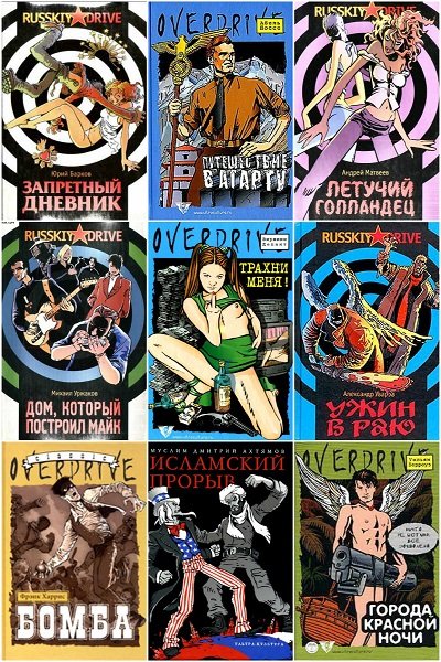 RUSSKIY DRIVE, OVERDRIVE - 2 cерии (20 книг) радикальной прозы от скандально известного издательства Ультра. Культура. Заявляя о своей альтернативности, издательство решило выбрать все возможные альтернативы. В серии издавались откровенно эротические романы Л. Ланч и В. Депант, постапокалиптические романы П. Бордажа, психопатологические триллеры Б. И. Элисса. Соседствует с ними скандально известный роман Д. Нестерова.